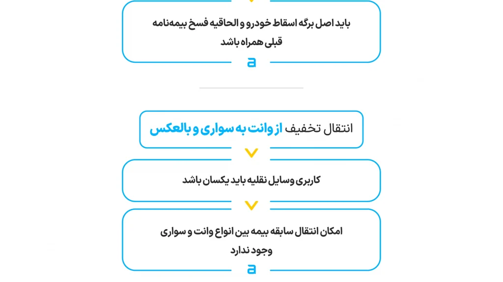 - انتقال تخفیف بیمه شخص ثالث فقط برای خودرو همنوع انجام میشود.